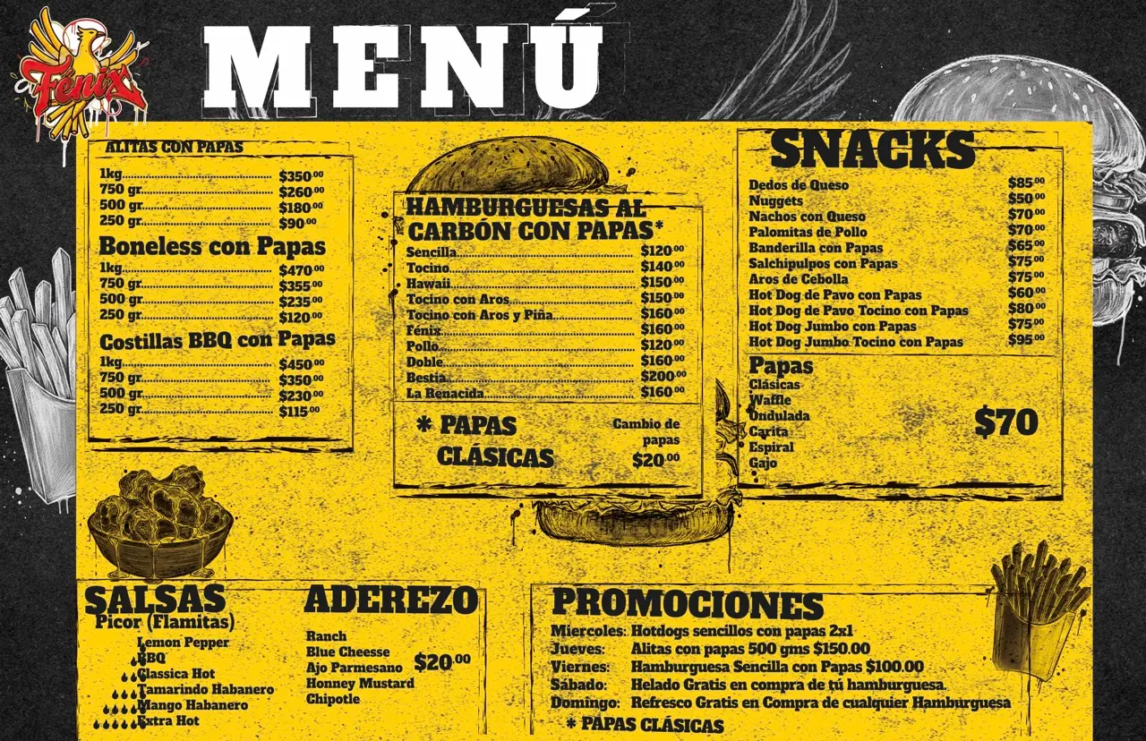 En Alitas y Boneless Fénix, te ofrecemos una experiencia de sabor inigualable con nuestra amplia selección de papas fritas. Disfruta de 7 tipos diferentes de papas, cada una cuidadosamente preparada para deleitar tu paladar. ¡Ven y prueba todas nuestras deliciosas opciones de papas fritas, el acompañamiento perfecto para cualquier ocasión!